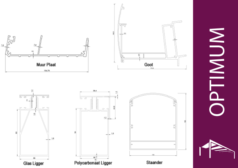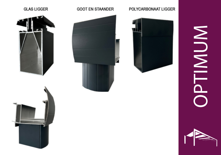 Ons Optimum model is ons basis model. Het is gemaakt van 2 millimeter dik aluminium van hoge kwaliteit en heeft een dubbele laag in de goot voor extra stevigheid. Ons optimum systeem kan een dak van 8 meter lang polycarbonaat dragen, en een glazen dak tot wel 3,5 meter! Onze optimum serie komt in 2 verschillende modellen: het standaard ronde model, en het kubus model met zeer strakke lijnen en moderne look. Onze optimum systemen worden geleverd met alle bijbehorende accessoires die al grotendeels geplaatst zijn bij levering, het gaat dan om de rubbers, LED verlichting en alle bijbehorende schroeven.
